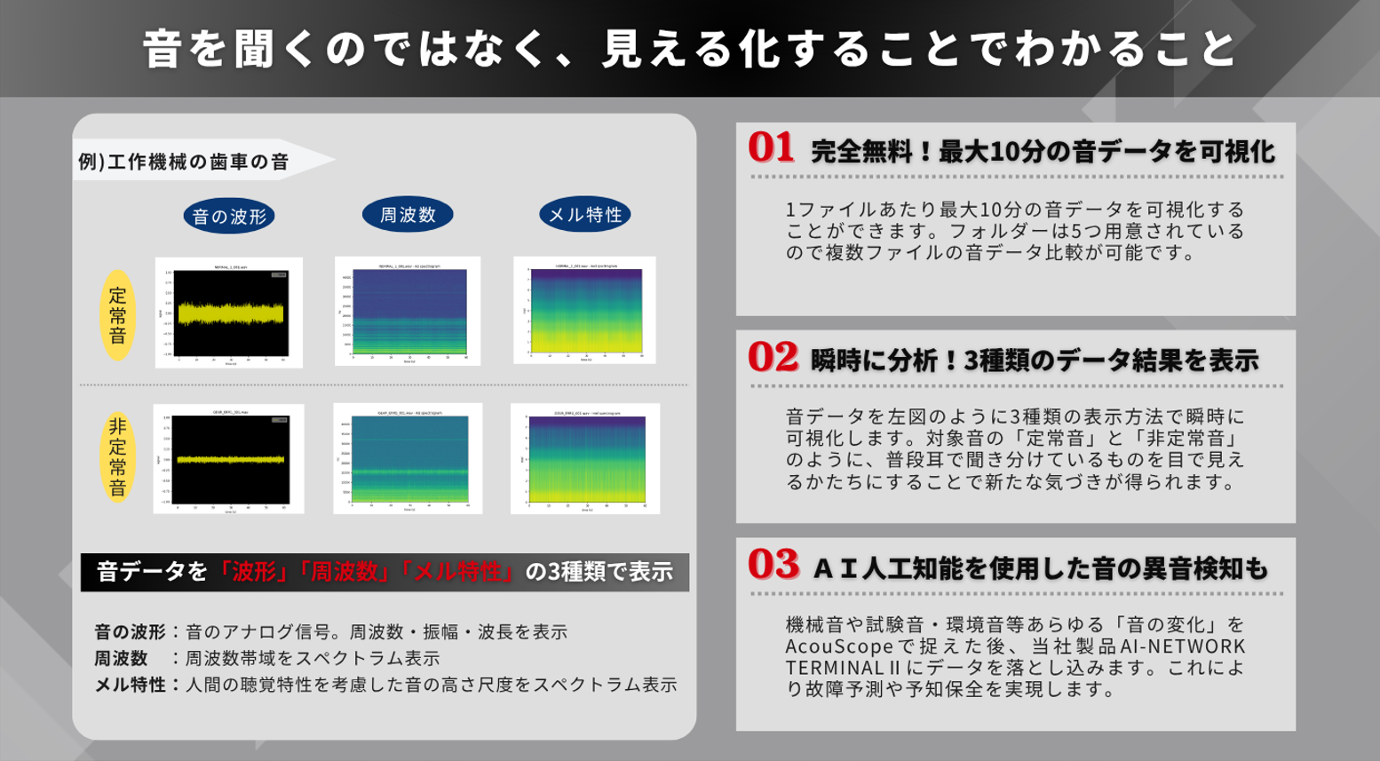 収録したデータを読み込ませるだけで、「音の波形」「周波数」「メル特性」の3種類で音の特徴を表示します。