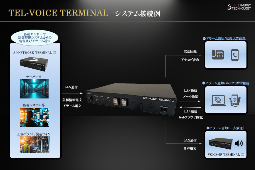 - 本装置は、お客様のシステムからLAN経由で情報を取得し、入手した情報を素早く音声文章に変換、音声メッセージで警報や応答をし現在の状況を読み上げてくれる装置です。